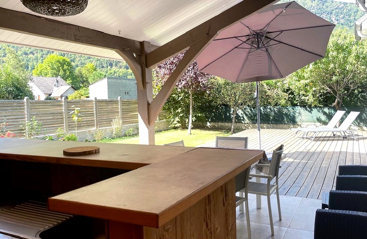 Un extérieur protégé pour des repas en famille ou entre amis. Tables et chaises de jardin, Barbecue au charbon de bois.