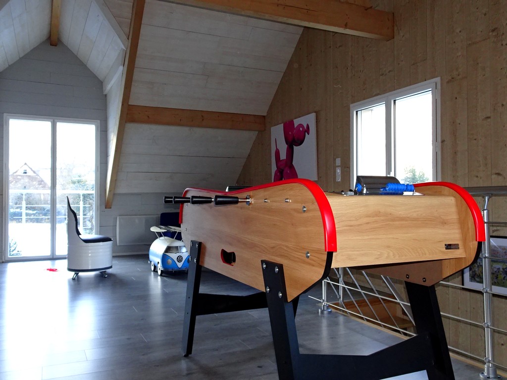 A l'étage: babyfoot, jeux de société, téléviseur.